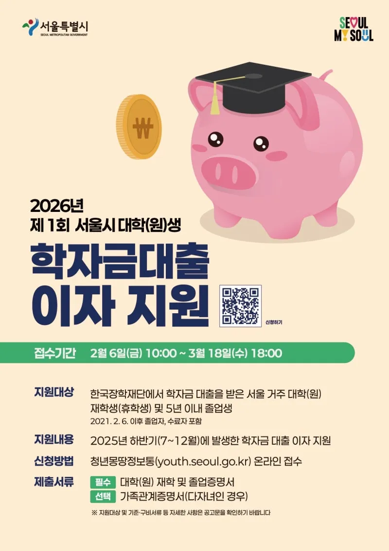 ✅지원 대상 한국장학재단 학자금 대출 상환 중인 서울 거주 대학(원) 재·휴학생, 졸업 후 5년 이내 청년 (2021. 2. 6 이후 졸업자, 수료자 포함) |