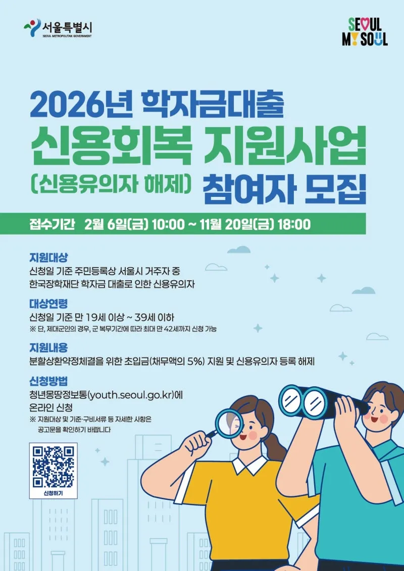 ✅신청 방법 청년 몽땅 정보통 누리집(youth.seoul.go.kr) 온라인 신청 ※ 신용유의자 등록 여부는 사업 신청 전 한국장학재단 대출상환상담센터(☎1599-2250)에서 본인 직접 확인 |