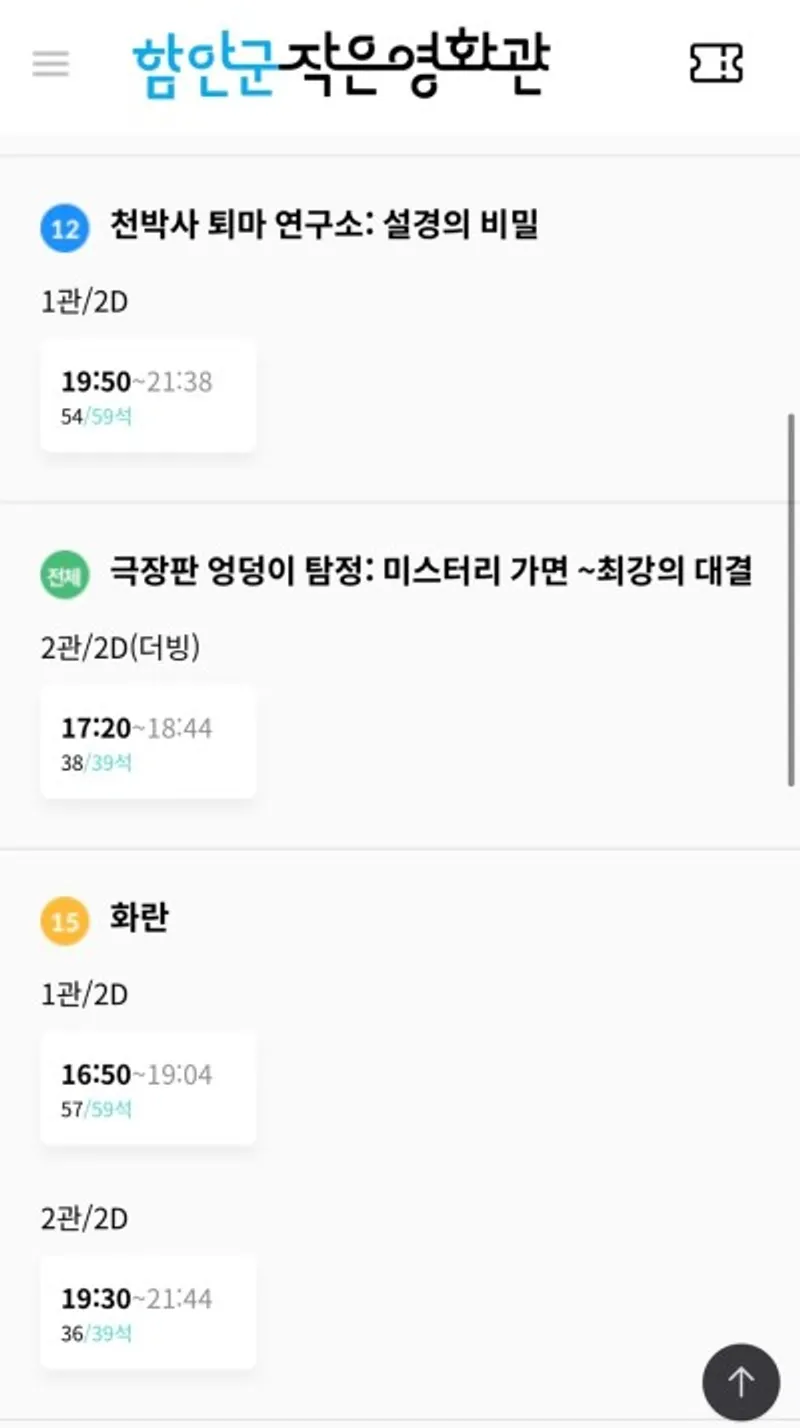 함안군 작은영화관 사전 예매는 위 홈페이지에서 할 수 있어요. 날짜별 상영 시간표를 바로 확인할 수 있고 회원가입 필요 없이 비회원도 예매할 수 있어서 편하답니다 :)