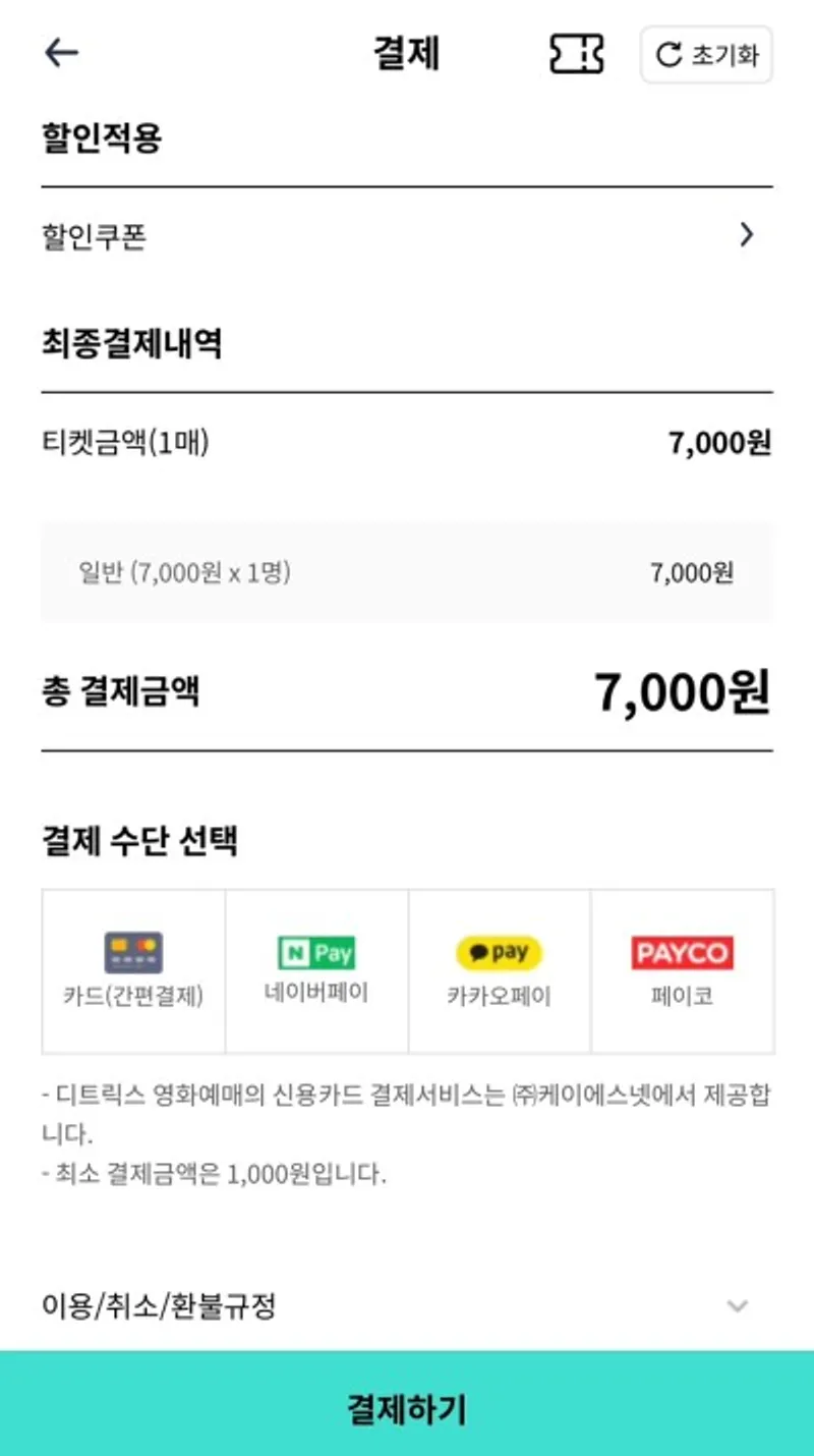 현금 없는 작은영화관 시범운영 중이기 때문에 체크/신용카드, 모바일 카드로 결제가 가능하고요