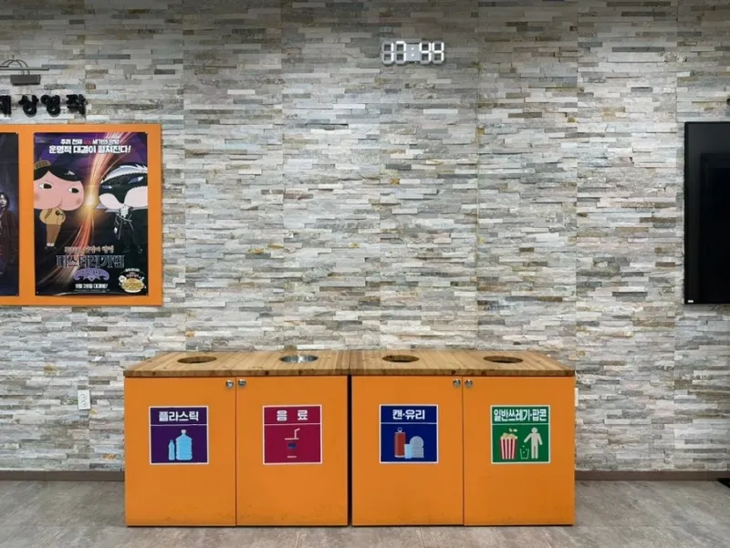 영화가 끝나고 난 후의 쓰레기는 영화관 중앙에 있는 쓰레기통에 분리수거를 하면 되고, 플라스틱, 음료, 캔/유리, 일반 쓰레기/팝콘으로 구분되어 있어요