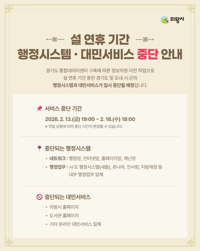 설 연휴 기간 동안 일부 행정시스템과 대민서비스가 일시 중단됩니다