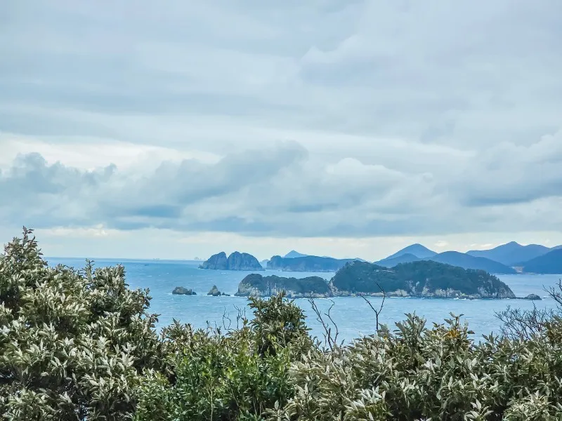 그럼에도 다행히 시야는 확보가 되어있었어요. 바로 앞에 보이는 섬이 그 유명한 외도 보타니아 입니다. 뒷편에 명승2호 해금강도 함께 보이고 있습니다.