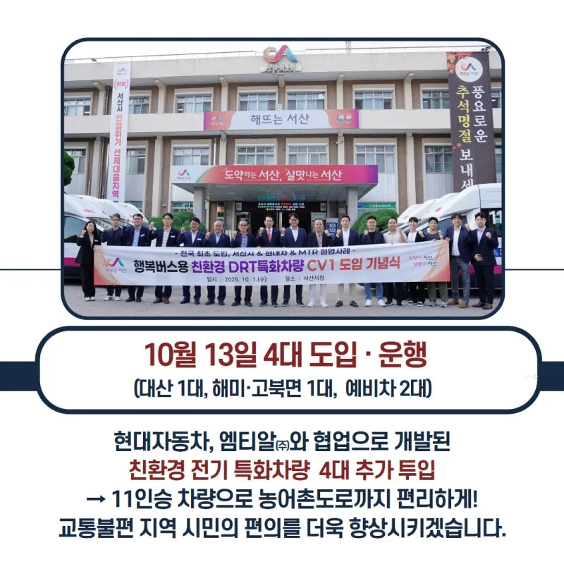 서산시, ‘전국 최초’ 친환경 수요응답형 교통수단 특화차량 도입- 10월 1일 기념식, 오는 13일 수요응답형 교통수단 ‘행복버스’에 해당 차량 추가 운영 -충남 서산시가 전국 최초로 수요응답형 교통수단에 특화된 차량을 도입, 교통약자의 이동권 증진에 나선다. 시는 지난 1일 시청 현관 앞에서 ‘친환경 수요응답형 교통수단 특화차량 도입 기념식’을 개최했다고 밝혔다. 이날 도입식에는 이완섭 서산시장을 비롯해 현대자동차, 엠티알㈜, 모트렉스 등 기업 관계자 20여 명이 참석했다. 참석자들은 새롭게 도입된 특화차량의 특성을 공유하고 시승...