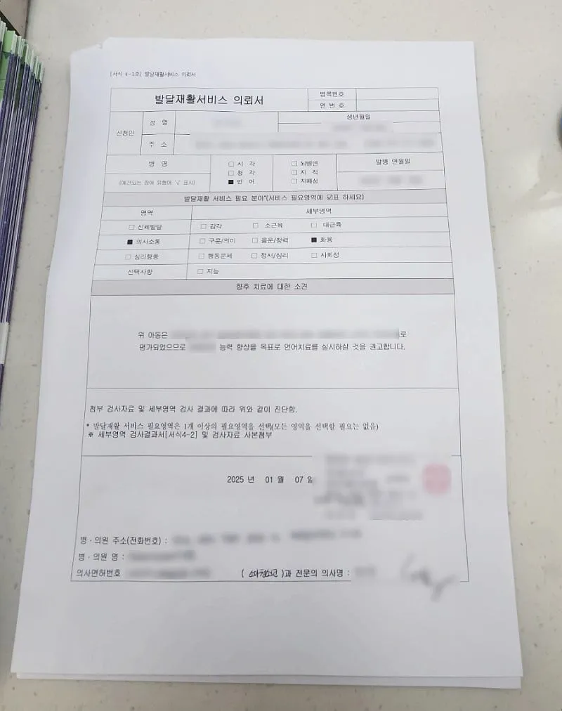 언어지연 및 장애의 경우 재활의학과, 이비인후과, 정신과, 신경과, 구강외과, 소아청소년과 전문의 발급 가능. |