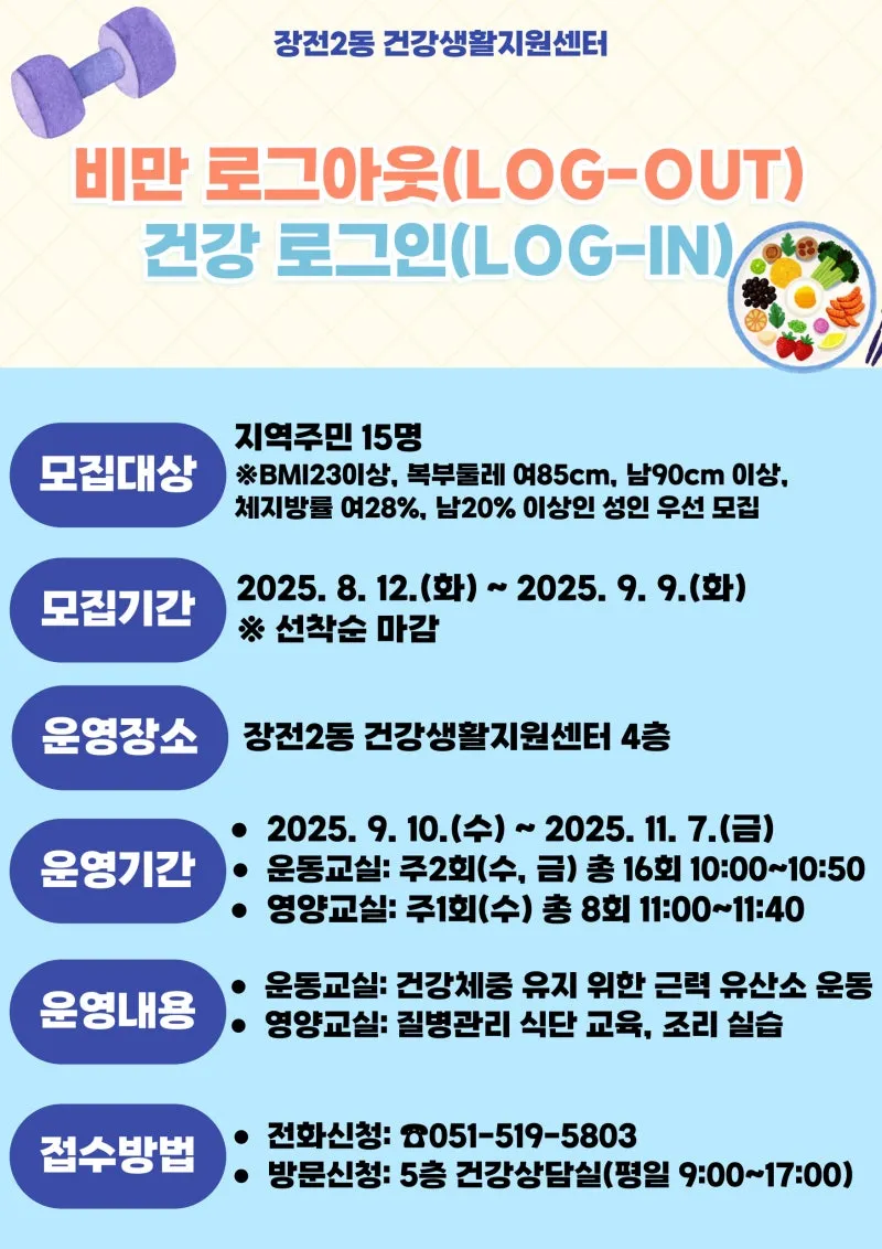 전화신청 (☎051-519-5803) 혹은 방문(장전2동 건강생활지원센터 5층 건강상담실)