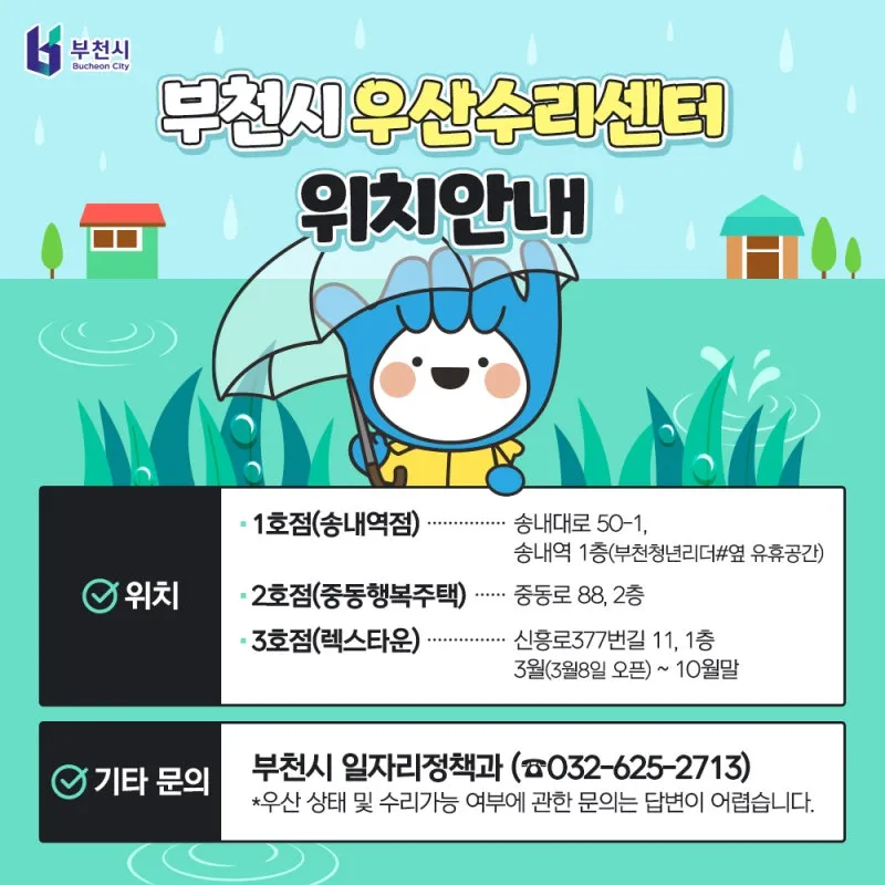 부천시 일자리정책과 📞032) 625-2713 * 우산 수리 가능 여부는 상태 확인 후 답변이 가능합니다. |