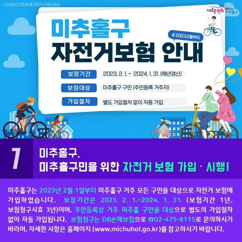 미추홀구는 2023년 2월 1일부터 미추홀구 거주 모든 구민을 대상으로 자전거 보험에 가입하였습니다. 보장기간은 2023. 2. 1.~2024. 1. 31. (보험기간 1연, 보험청구시효 3년)이며, 주민등록상 거주 미추홀 구민을 대상으로 별도의 가입 절차 없이 자동 가입됩니다. 보험청구는 DB손해보험으로 ☎02-475-8115로 문의하시기 바라며, 자세한 사항은 홈페이지 (www.michuhol.go.kr)를 참고하시기 바랍니다.