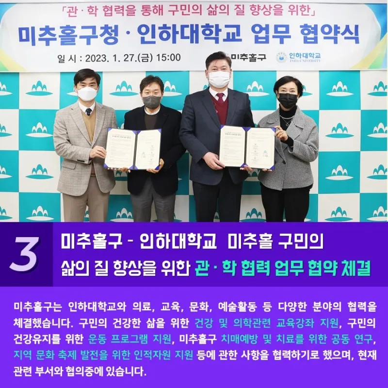 미추홀구는 인하대학교와 의료, 교육, 문화, 예술활동 등 다양한 분야의 협력을 체결했습니다. 구민의 건강한 삶을 위한 건강 및 의학관련 교육강좌 지원, 구민의 건강유지를 위한 운동 프로그램 지원, 미추홀구 치매예방 및 치료를 위한 공동 연구, 지역 문화 축제 발전을 위한 인적자원 지원 등에 관한 사항을 협력하기로 했으며, 현재 관련 부서와 협의중에 있습니다.