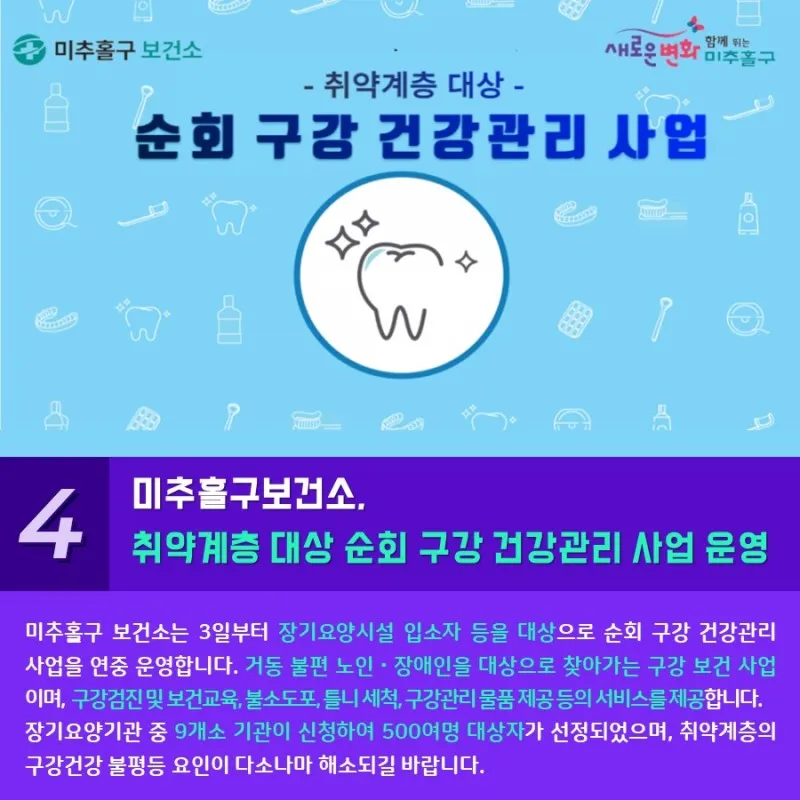 미추홀구보건소는 3일부터 장기요양시설 입소자 등을 대상으로 순회 구강 건강관리 사업을 연중 운영합니다. 거동 불편 노인과 장애인을 대상으로 찾아가는 구강 보건사업이며, 구강검진 및 보건교육, 불소도포, 틀니 세척, 구강관리 물품 제공 등의 서비스를 제공합니다. 장기요양기관 중 9개소 기관이 신청하여 500여명 대상자가 선정되었으며, 취약계층의 구강건강 불평등 요인이 다소나마 해소되길 바랍니다.