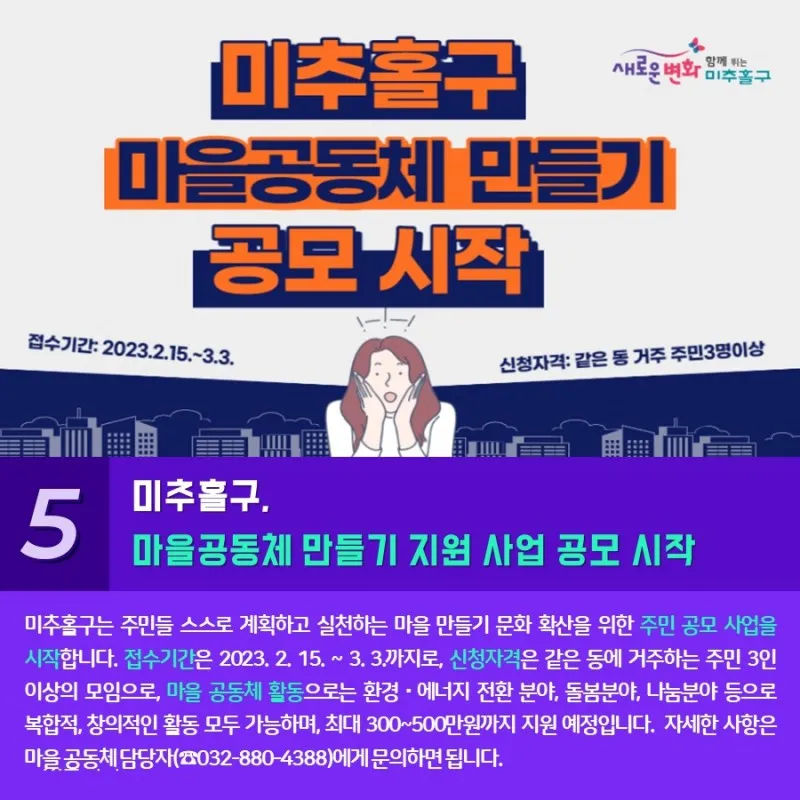 미추홀구는 주민 스스로 계획하고 실천하는 마을 만들기 문화 확산을 위한 주민 공모 사업을 시작합니다. 접수기간 2023. 2. 15. ~ 3. 3.까지, 신청자격 같은 동에 거주하는 주민 3인 이상의 모임으로, 마을 공동체 활동으로는 환경·에너지 전환 분야, 돌봄 분야, 나눔 분야 등으로 복합적, 창의적인 활동 모두 가능하며, 최대 300~500만원까지 지원 예정입니다. 자세한 사항은 마을 공동체 담당자(☎ 032-880-4388)에게 문의하면 됩니다.
