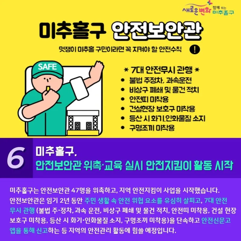 미추홀구는 안전보안관 47명을 위촉하고, 지역 안전지킴이 사업을 시작했습니다. 안전보안관은 임기 2년 동안 주민 생활 속 안전 위협 요소를 유심히 살피고, 7대 안전 무시관행(불법 주 정차, 비상구 폐쇄 및 물건 적치, 과속 운전, 안전띠 미착용, 건설 현장 보호구 미착용, 등산 시 화기 인화물질 소지, 구명조끼 미착용)을 단속하고 안전신문고 앱을 통해 신고하는 등 지역의 안전관리 활동에 힘쓸 예정입니다.