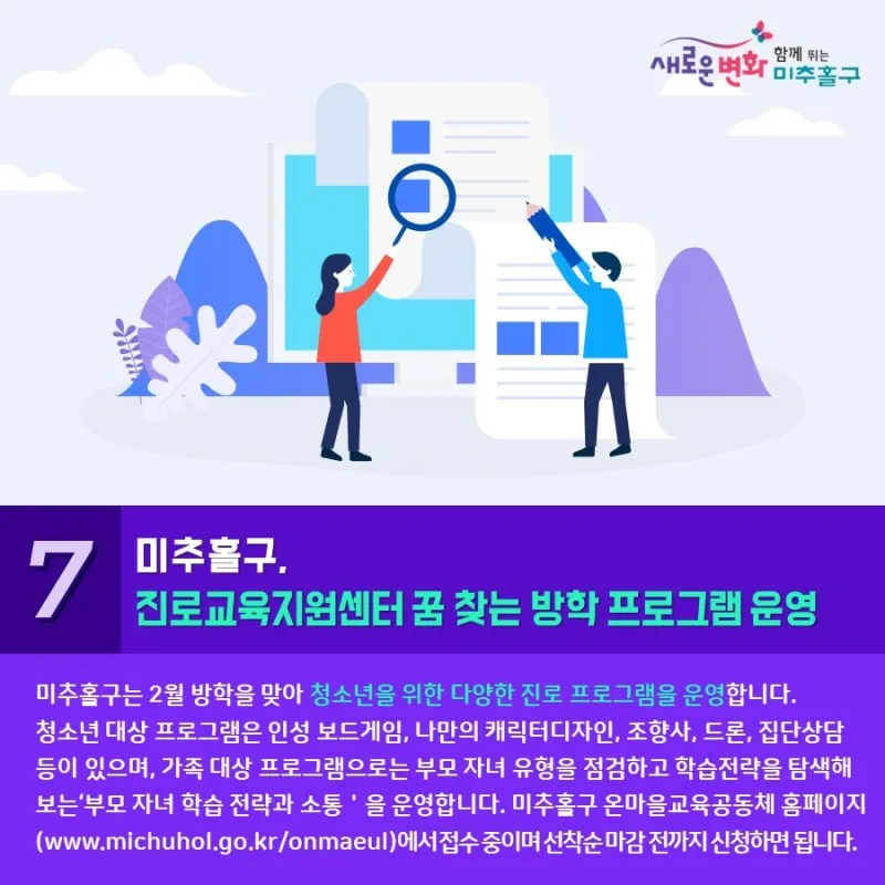 미추홀구는 2월 방학을 맞아 청소년을 위한 다양한 진로 프로그램을 운영합니다.