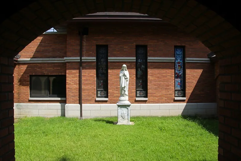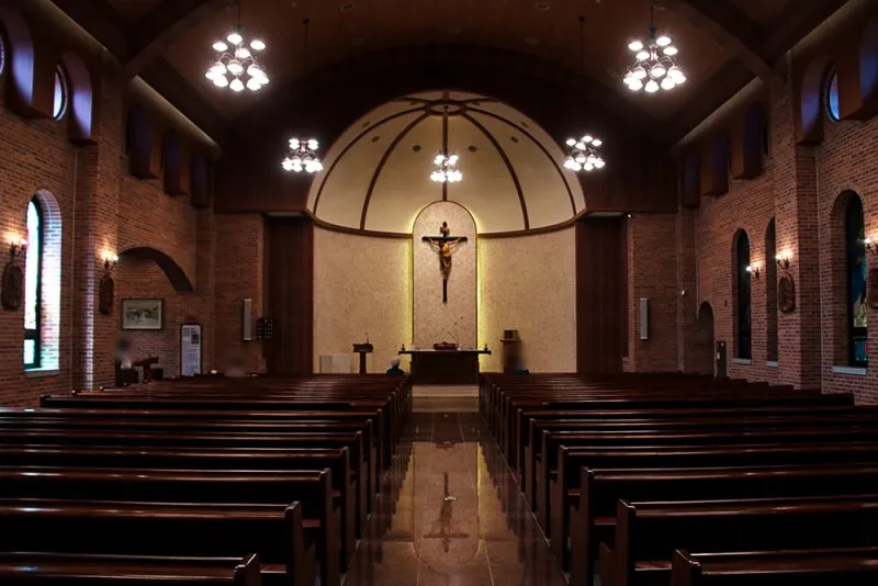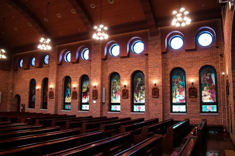 초록 잔디 위에 빨간 벽돌로 건축된 성당 건물이 보이는데요