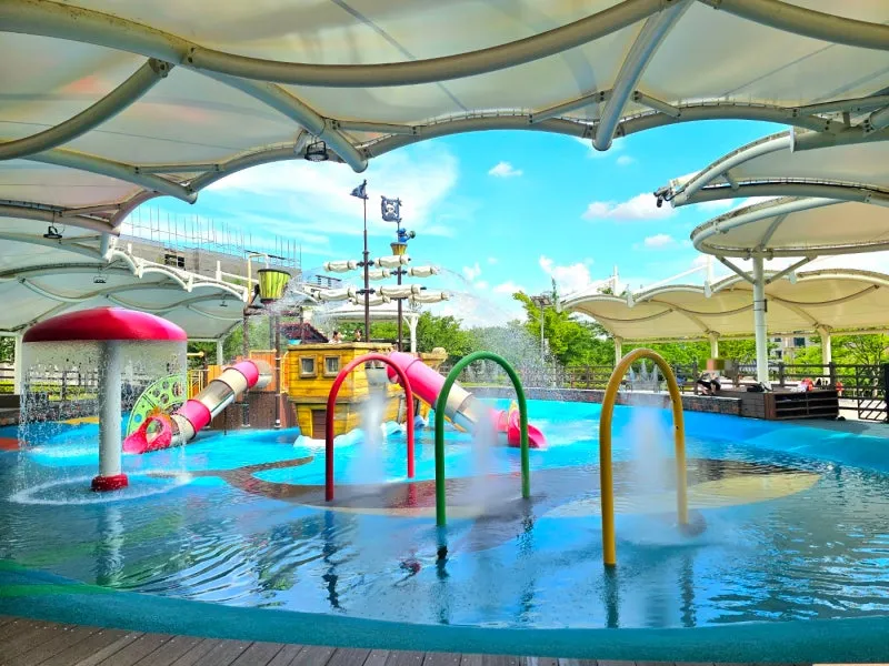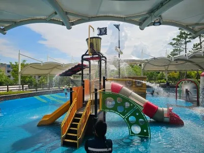 이곳 가흥 안뜰 공원 물놀이장은 시원한 물이 나오는 우산형 분수대, 미끄럼틀, 해적선 미끄럼틀, 양동이 물놀이, 쿨링 형 물놀이 시설 등 있을 건 다 있어서 시원하게 물놀이가 가능합니다.