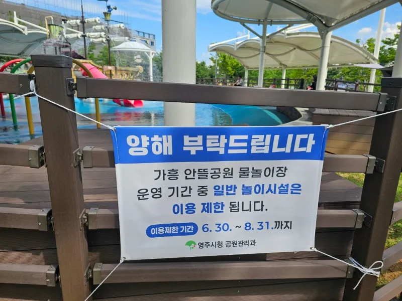영주에는 많은 물놀이장과 바닥분수가 있는데 그중 도심과 가까워서 접근성이 좋은 가흥 안뜰 공원 물놀이장은 초등학생 이하 어린이를 대상으로 운영되어서 물놀이장의 물 높지 않고 아이들에게 딱 좋은 곳입니다.