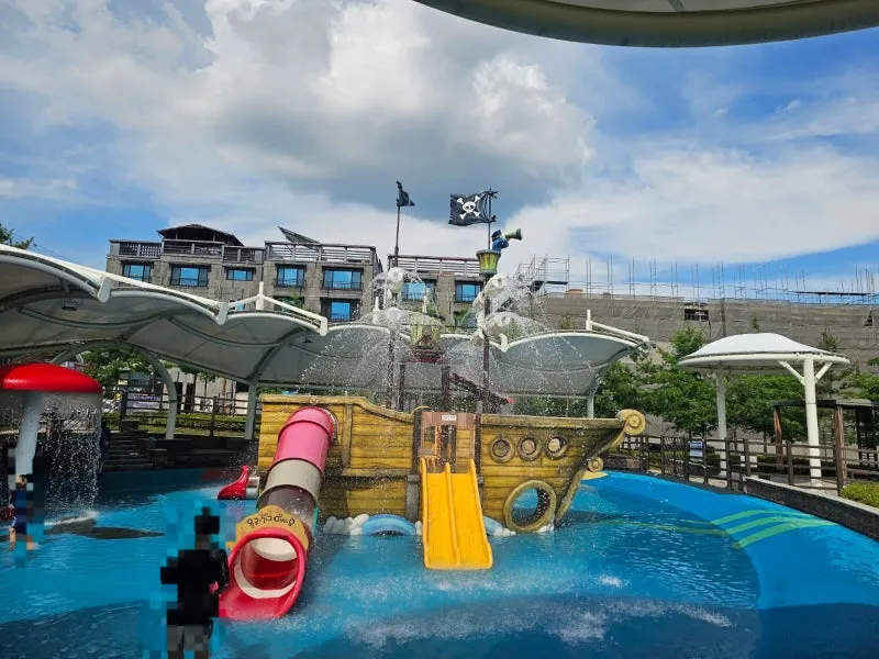 해적선에서 물이 나오고 있어 마치 바다를 운행하고 있는 것 같은데요, 안으로 들어가서 시원하게 물을 맞고 미끄럼틀로 내려올 수 있습니다.