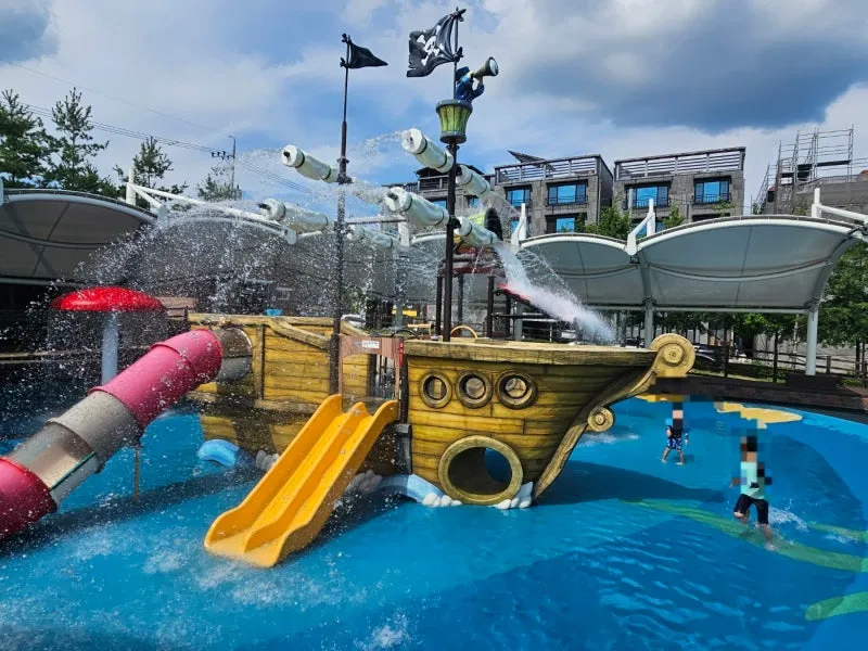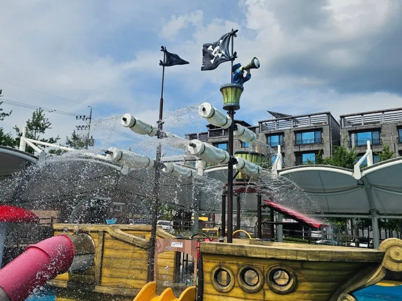 무더운 밖 날씨와 달리 물이 계속 나오고 있어서 근처에 있는 것만으로도 시원한 영주 가흥 안뜰 공원 물놀이장은 아이들이 좋아할 해적선 모형이 있고 주변에서 물이 나오고 있어서 더 좋은 것 같습니다.