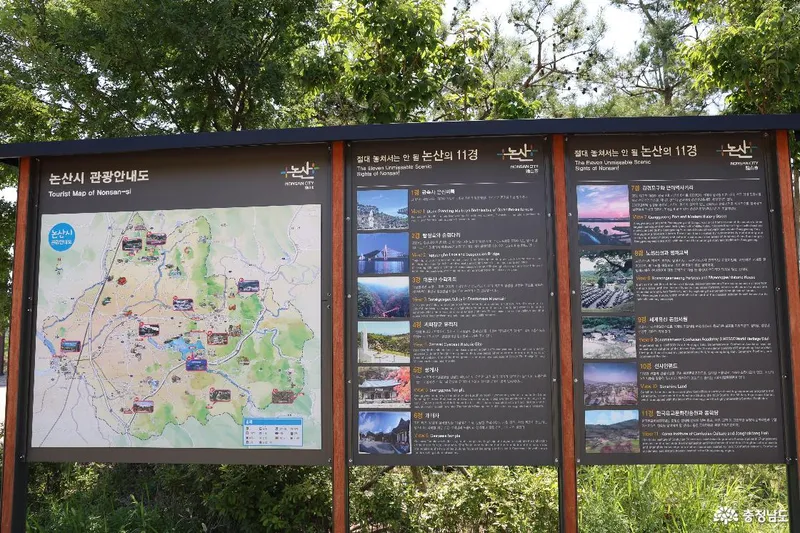 충남 논산의 11경은 관촉사 은진미륵, 탑정호와 출렁다리, 대둔산 수락계곡, 계백장군 유적지, 쌍계사, 개태사, 강경포구와 근대역사거리, 노성산성과 명재고택, 세계유산 돈암서원, 선샤인랜드, 한국 유교문화 진흥원과 종학당이 있습니다.