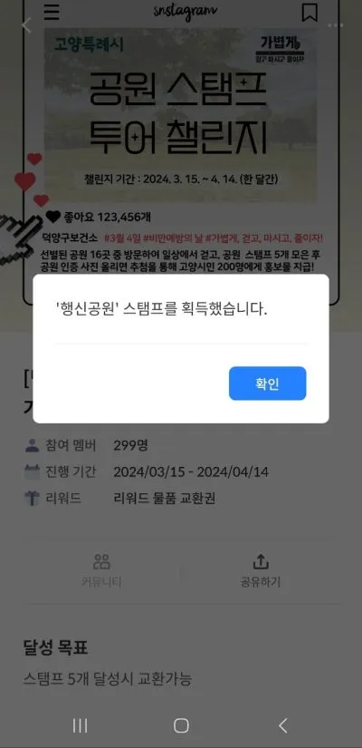 ‘ㅇㅇ공원 스탬프를 획득했습니다’라는