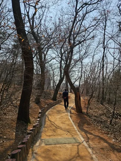 나무 사이 산책로를 걸으며 새소리를 듣는데