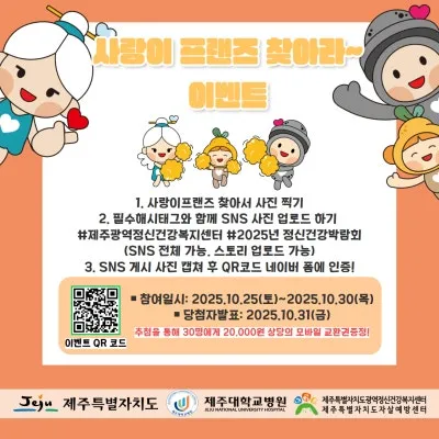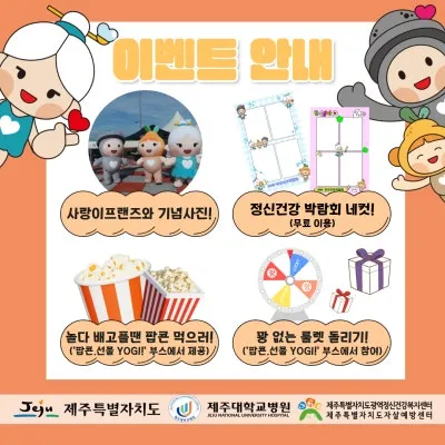 2 025 년 정신건강박람 회 2025년 10월 25일(토) 탑동광장에서 2025 년 정신건강박람회를 개최합니다!!! <이벤트 안내> ● 사랑이프랜즈 기념촬영 ● 무료 네컷포토 부스 운영 ● 팝콘 나눔 부스 운영 ● 룰렛 뽑기 이벤트 부스 운영 ● 사랑이프랜즈를 찾아라! ① 행사장 내에 여기 저기 보이는 사랑이프랜즈를 찾아서 사진 찍기 ② 필수해시태그와 함께 SNS 사진 업로드 하기 (#제주광역정신건강복지센터 #사랑이프랜즈 #2025정신건강박람회) ③ SNS 게시 사진 캡쳐하여 네이버 폼에 인증하기...