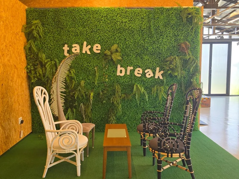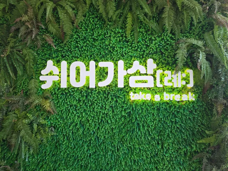 'take a break'라고 적힌 녹색 식물 벽면은 아름다운 포토존이 되어주고,