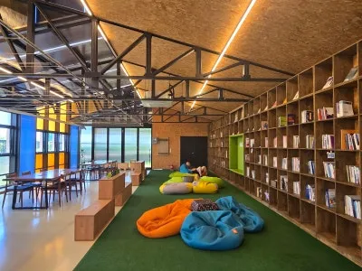 바닥에 깔린 초록색 인조 잔디 위에는 알록달록한 빈백 소파들이 자유롭게 놓여 있습니다.