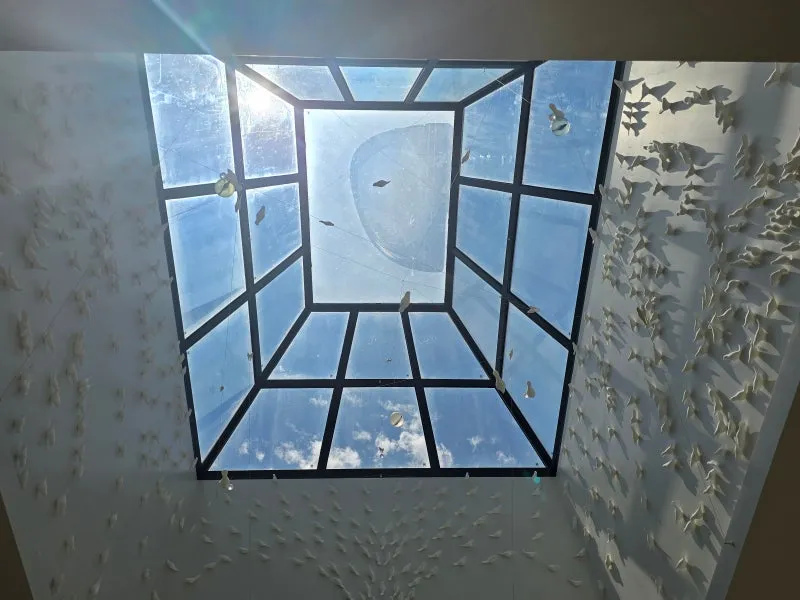 천장에서 쏟아지는 부드러운 자연광과 함께 흰색 종이비행기 모형들이