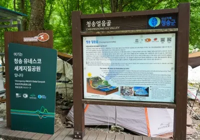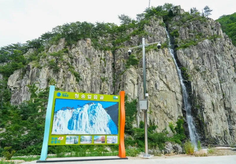 으로 변하는 청송얼음골의 절벽지형의 홍보 안내판을 담고 있어, 지역의