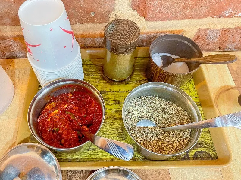 테이블에는 기본적으로 흔히 다대기라고 불리는 양념장과 들깨가루, 소금, 후추가 있어서