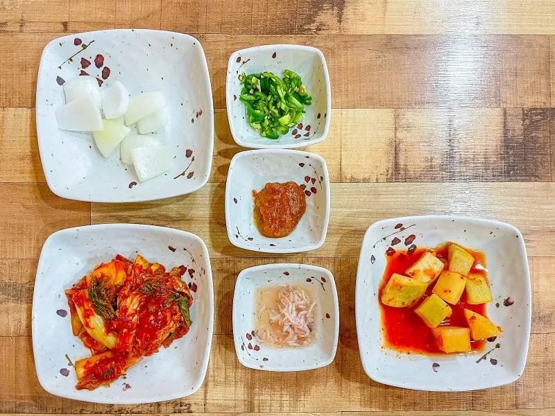 밑반찬 종류로는 김치, 깍두기, 새우젓, 쌈장, 양파, 고추 등이 나옵니다.