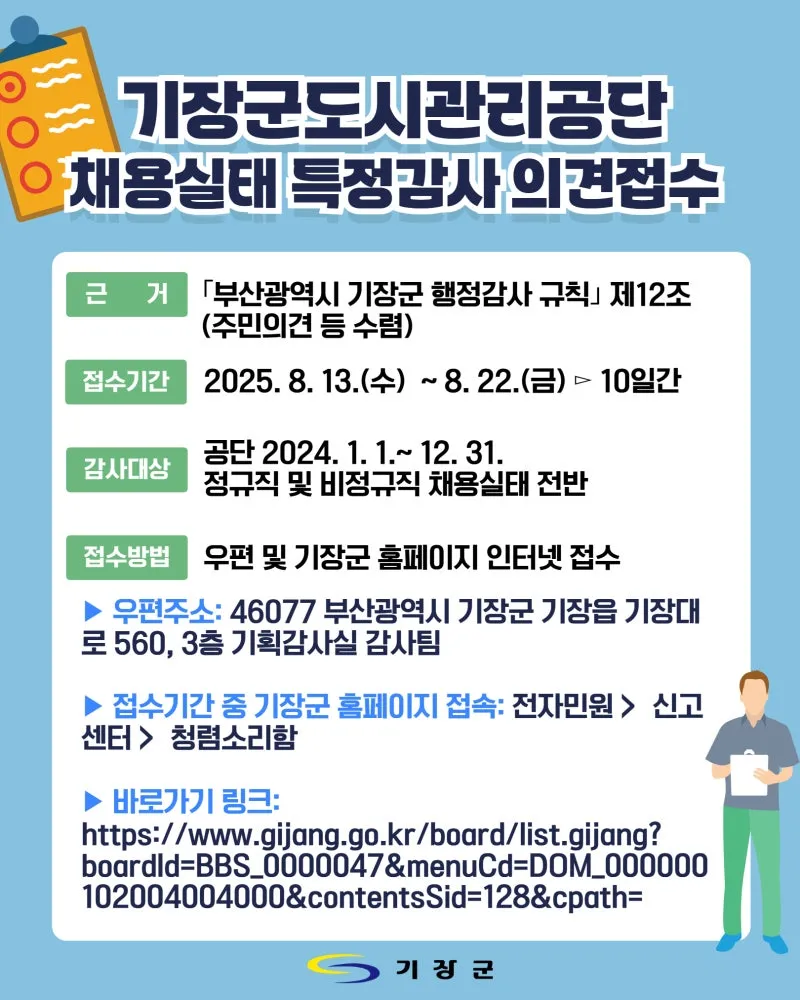📢 기장군도시관리공단 채용실태 특정감사 의견접수 안내
