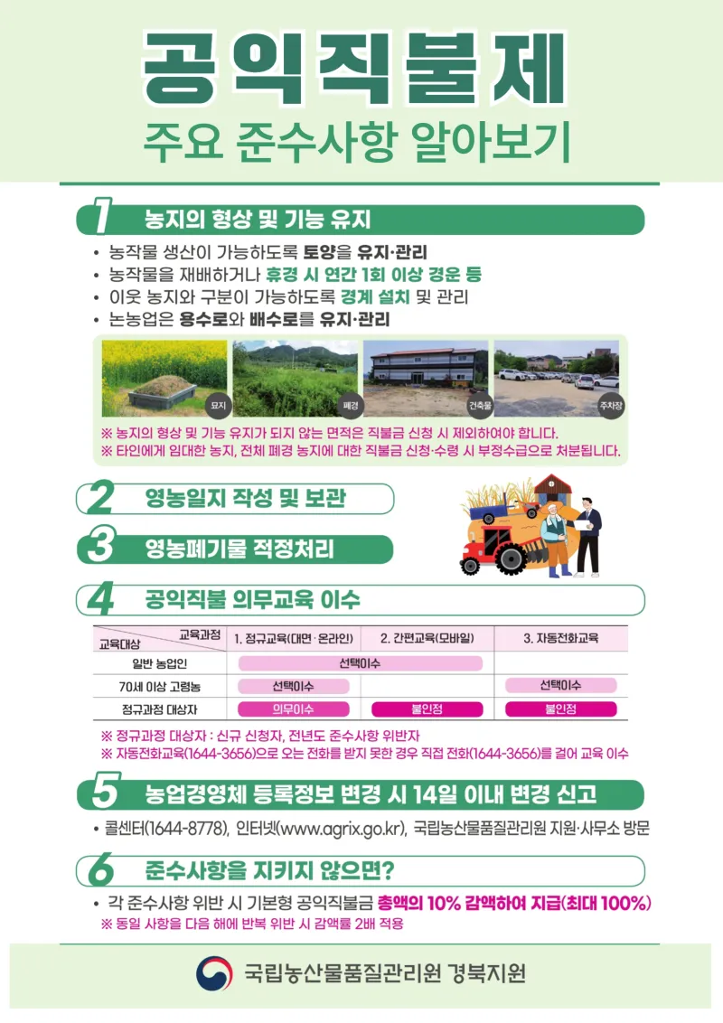 · 주요 준수사항 : ①농작물 생산이 가능하도록 토양을 유지·관리, ②공익기능 증진 관련 교육 이수, ③영농폐기물 적정처리, ④영농일지 작성·보관 등