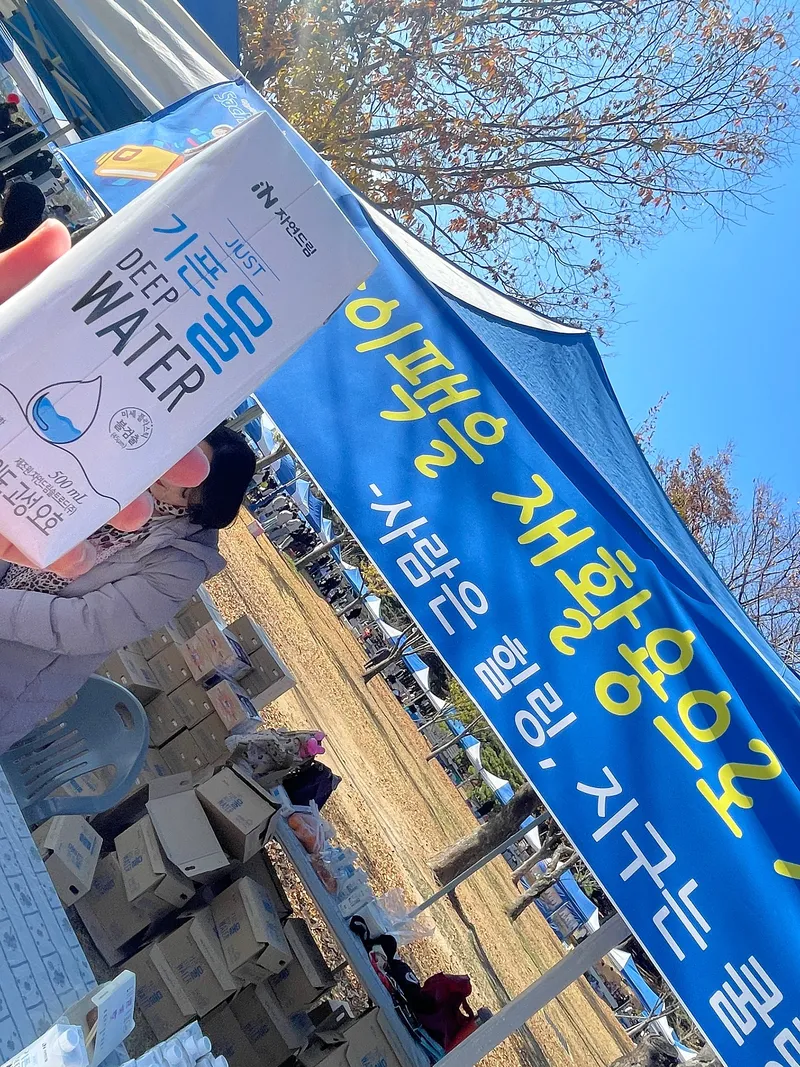 지구를 지키는 재활용 팩 만들기에 서명하고 물도 하나 받아 왔습니다.