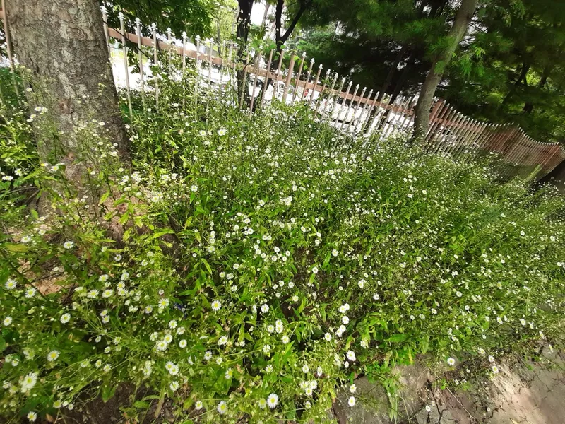 공원의 산책로를 걷다 보니, 현대홈타운과 연결된 통로, 건영아파트와 연결된 통로를 보았습니다. 곳곳에는 쉼터가 여유 있게 마련되어 있으니 산책을 하다 쉬었다 가보세요. 쉼터 주변에는 여름에 피는 꽃, 개망초 꽃향기도 느낄 수 있을 겁니다.
