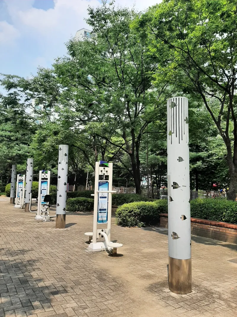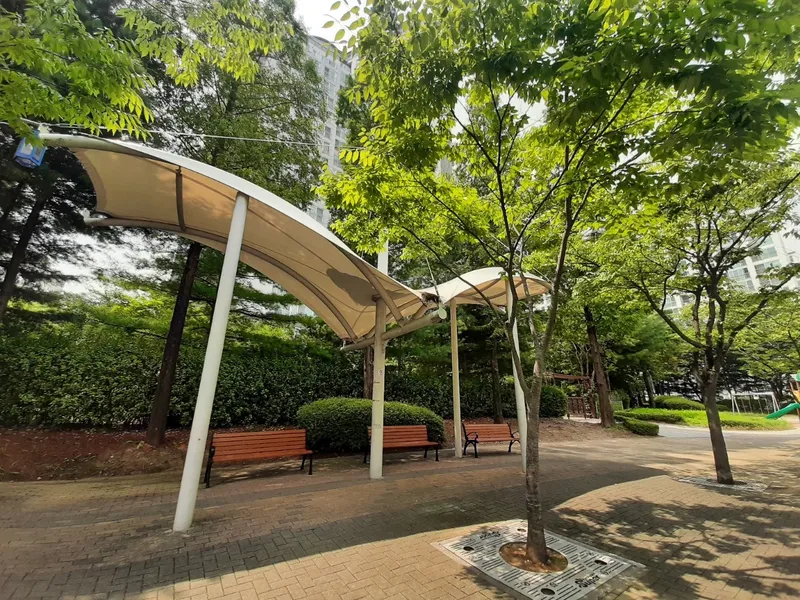 쉼터의 그늘막은 요즘같이 햇빛이 뜨거운 여름날에 앉았다 가기에 좋은 장소가 됩니다. 한낮에는 운동기구를 이용하기에는 많이 더운 감이 있겠지만, 조금씩 어두워지기 시작하는 오후 6시쯤에는 운동기구를 통해 체력단련을 해보세요.
