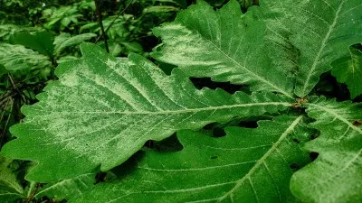 참나무 잎에 참나무 꽃가루가 떨어져 있습니다.