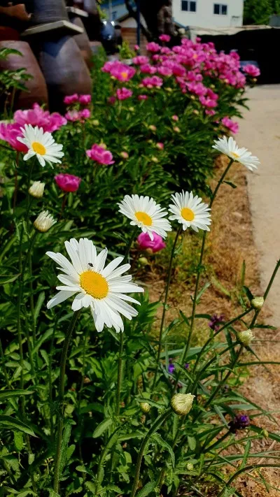 로컬푸드직매장을 뒤로 하고 서봉산 삼림욕장으로 가는 길로 들어서니, 왼쪽 편에 샤스타 데이지와 분홍색 작약꽃이 눈에 들어옵니다.