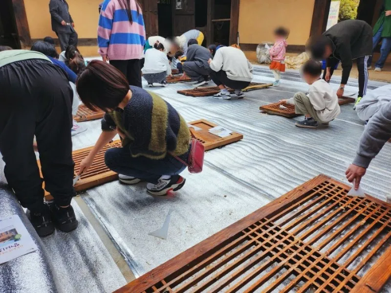 밤가시초가 창호 바르기 체험 중간에
