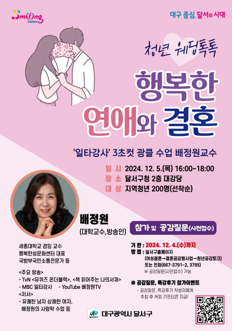 [대구 달서구] 3초컷 광클수업 배정원교수! '청년 웨딩톡톡, 행복한 연애와 결혼' 신청자 모집
