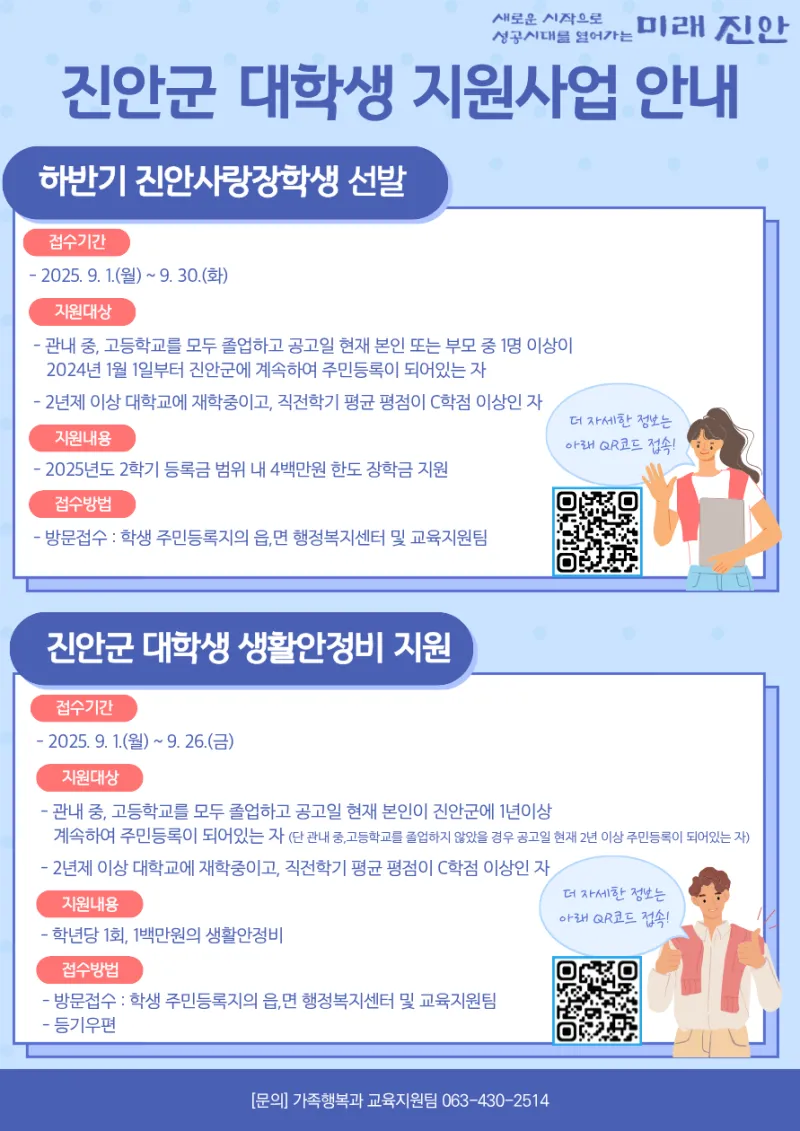 👥 대상: 관내 중·고등학교 모두 졸업 & 진안 거주, 2년제 이상 대학 재학생(C학점 이상)