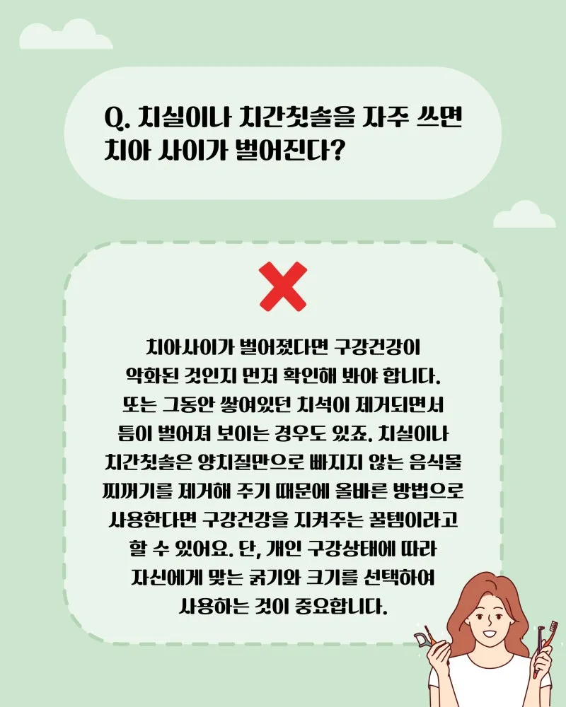 ❓ 치실이나 치간칫솔을 자주 쓰면 치아 사이가 벌어진다?