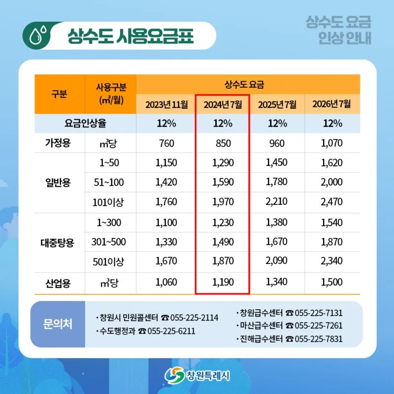 - 상수도 사용요금 : 2024년 7월 기준으로 12% 인상됩니다.