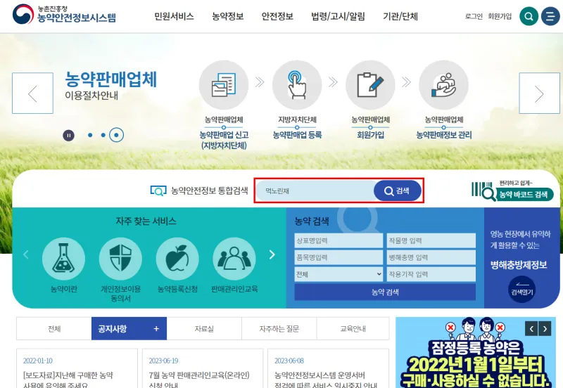 1. 농촌진흥청 농약안전정보시스템 우리집에 접속하여 '먹노린재'를 검색합니다.