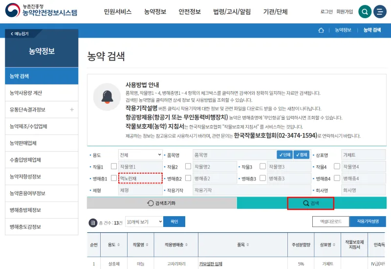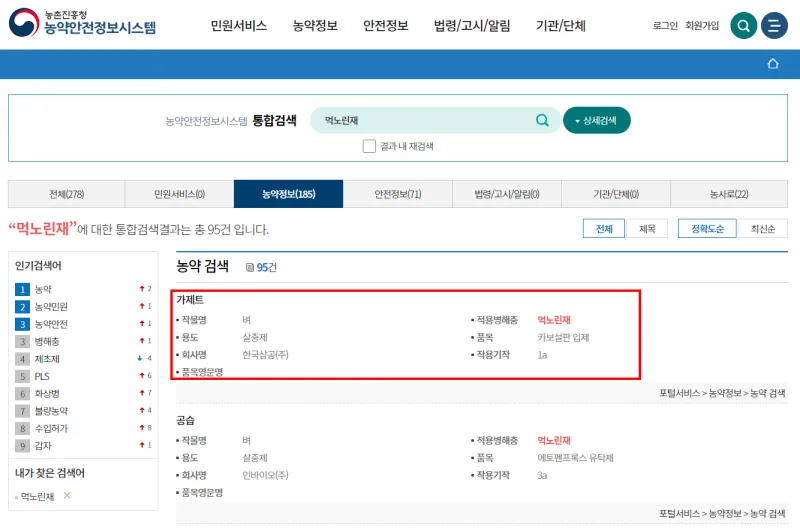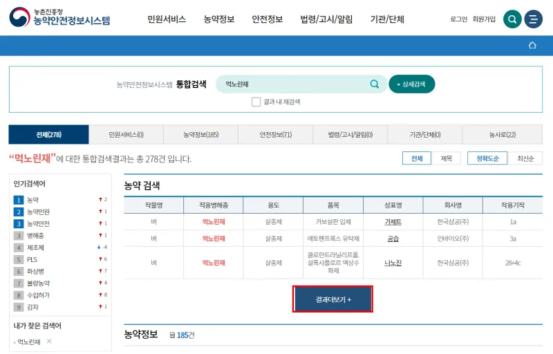 2. 결과 더보기를 클릭하여 전체 방제약제를 확인합니다.