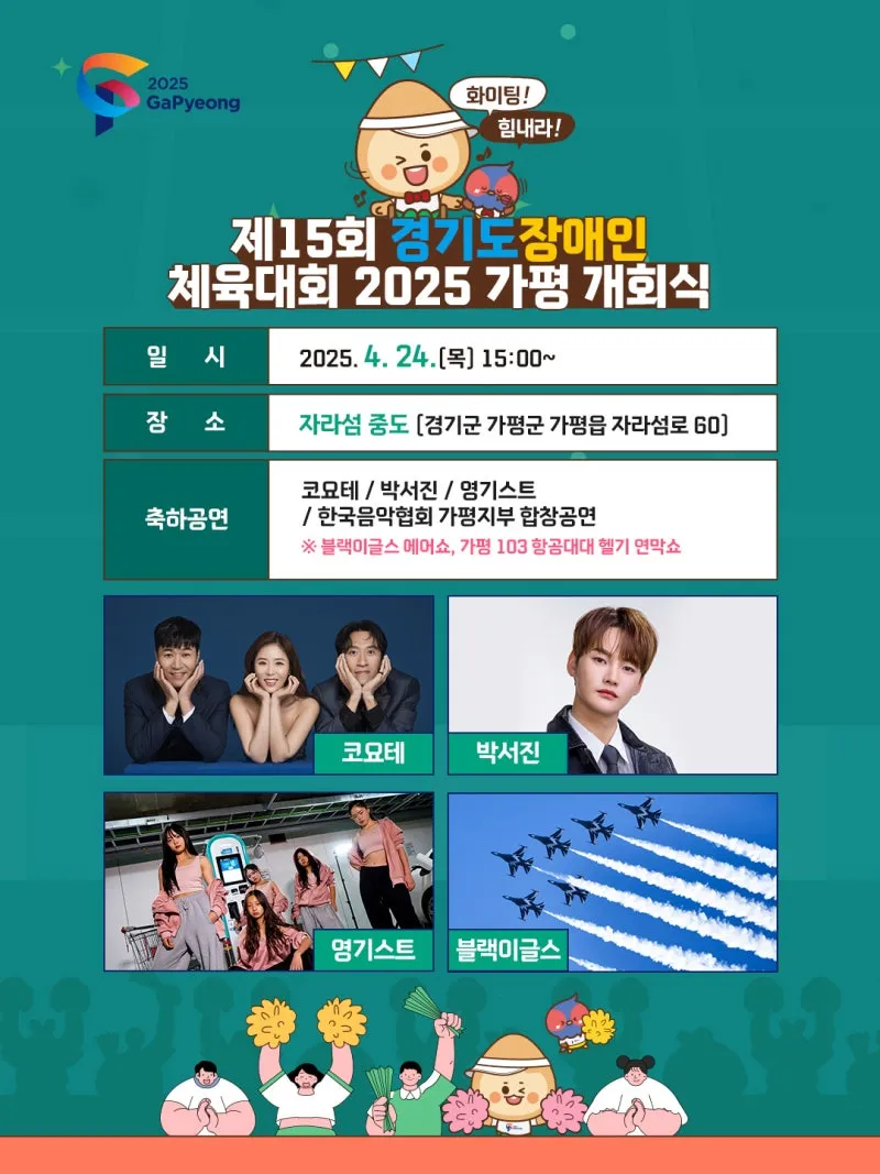 "제15회 경기도장애인체육대회 2025 가평" 개회식이 자라섬 중도에서 개최되오니 여러분들의 많은 관심과 참여를 바랍니다. 특히, 개회식의 BIG 이벤트인 경품추첨도 진행하오니 많은 관심 바랍니다.