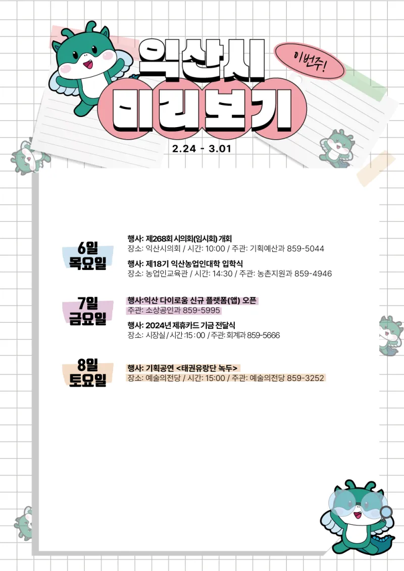#익산시 #익산주간소식 #마룡이와함께 #슬기로운친구생활 #익산시주민과의대화 #익산형청년창업지원사업 #백제왕궁박물관박물이벤트 #익산다이로움 #태권유랑단녹두 #익산공연