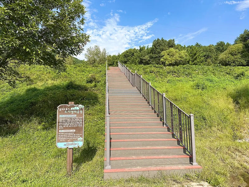 읍내방죽(저수지)을 마주할 수 있는 읍내소류지 도시생태공원 계단이 있습니다. 한 여름에는 가만히 있어도 땀이 날 정도로 습해서 부담이 되지만 이제 날씨가 많이 풀렸기 때문에 산책하기 상당히 좋습니다.
