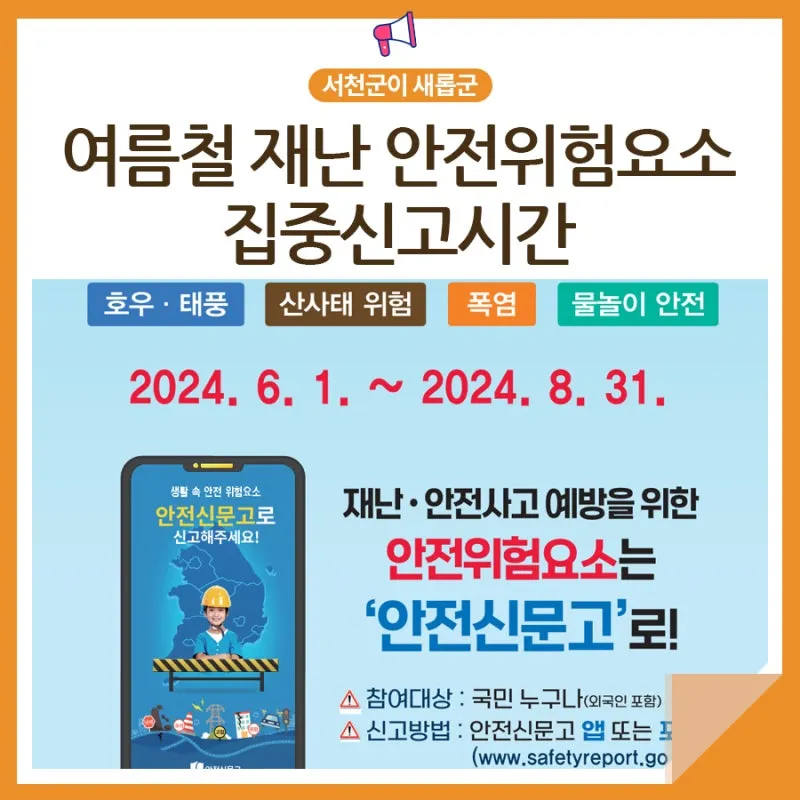 {"title":"안전한 여름을 위해~ 여름철 재난·안전위험요인 집중신고기간","source":"https://blog.naver.com/seocheonpr/223492870105","blogName":"Seocheon","blogId":"seocheonpr","domainIdOrBlogId":"seocheonpr","nicknameOrBlogId":"서천군청","logNo":223492870105,"smartEditorVersion":4,"meDisplay":true,"lineDisplay":true,"outsideDisplay":true,"cafeDisplay":true,"blogDisplay":true}